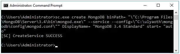 sc.exe create MongoDB binPath= "\"C:\Program Files\MongoDB\Server\3.4\bin\mongod.exe\" --service --config=\"C:\ulyaoth\mongodb\config\mongod.conf\"" DisplayName= "MongoDB 3.4 Standard" start= "auto"