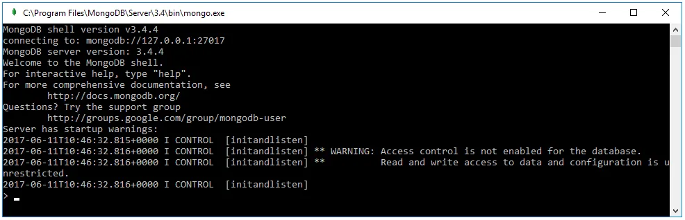 Navigate to C:\Program Files\MongoDB\Server\3.4\bin and double-click on “mongo”. A terminal window should open that looks like this: