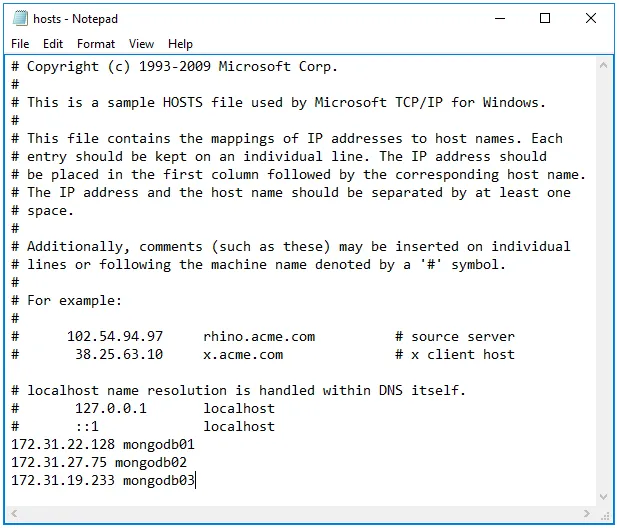 Please be aware: if you cannot reach the names “mongodb02” or “mongodb03,” you must use the full IP address of the server or add them to your hosts file (see screenshot below).