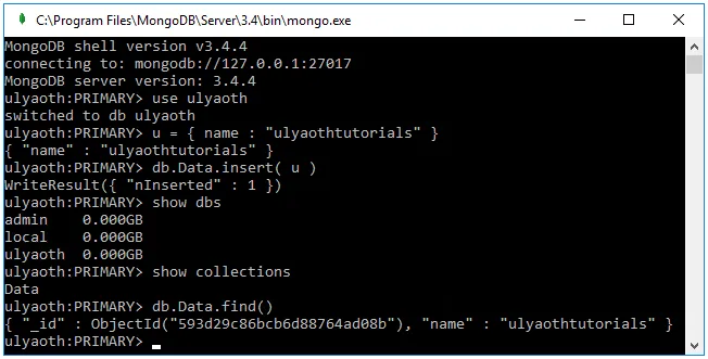 As you can see, show dbs displayed the “ulyaoth” database, show collections showed the “Data” collection, and db.Data.find() confirmed that the collection contains the information.
