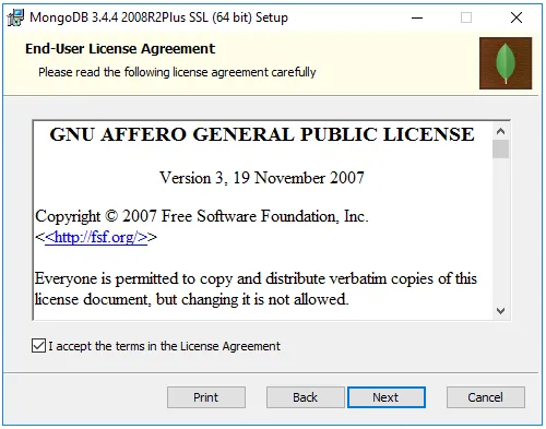 Read the license, tick the box to accept the terms, and press Next.