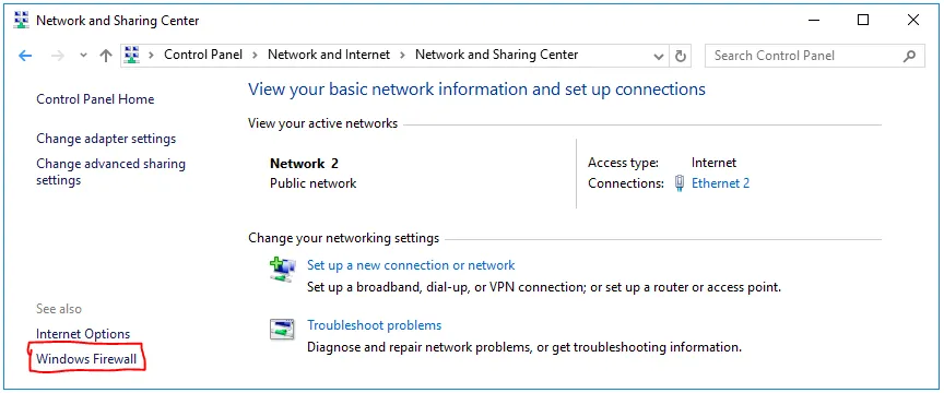 Go to your Control Panel, click on Network and Internet, then click on Network and Sharing Center. On the bottom left side, click on Windows Firewall.