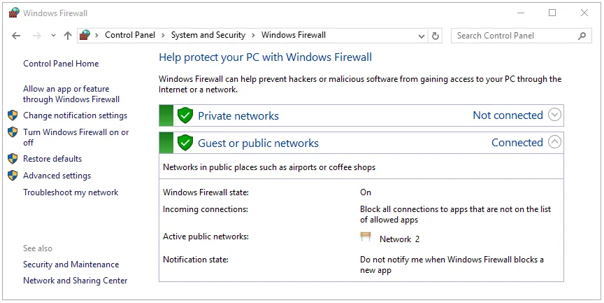 You should now see your Windows Firewall settings like this: