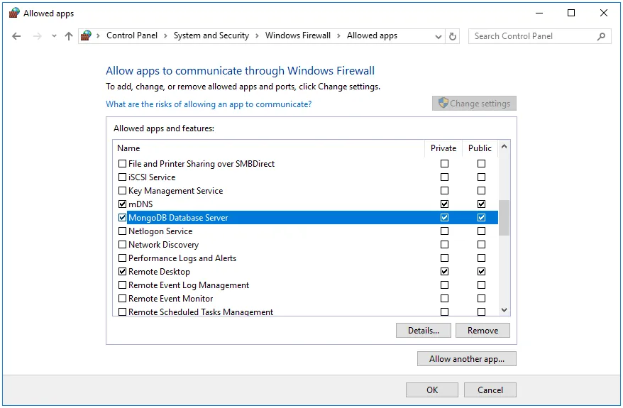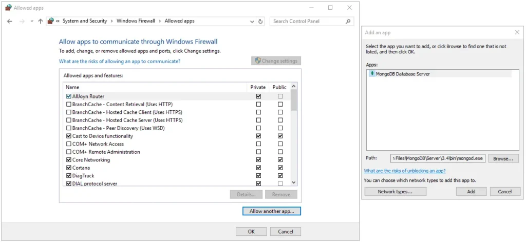 On this window, click on “Allow an app or feature through Windows Firewall.” The window will change; click on “Allow another app…” and browse to the MongoDB folder. Choose the following path: C:\Program Files\MongoDB\Server\3.4\bin\mongod.exe. It should look like this:
