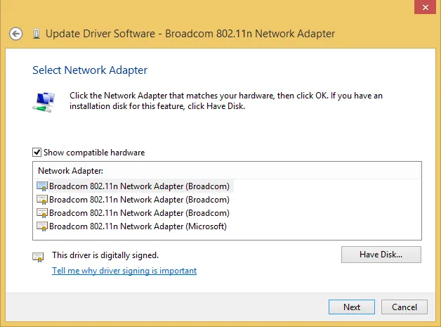 - You will now see a list of compatible drivers. You need to select the version that corresponds to the 2011 driver date. In my case, it was the top option. Select it and click Next.